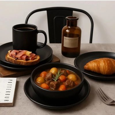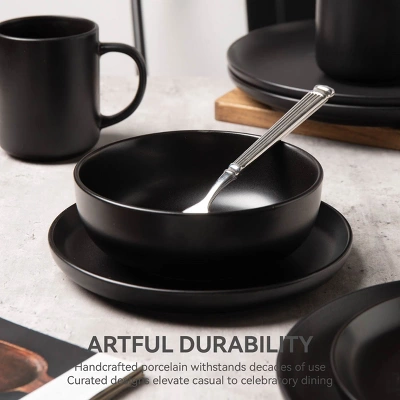 SEVOBAL 12-Piece Stoneware Dinnerware Set Microwave Dishwasher Friendly Stackable Matte Glaze Plates Bowls Service For 4, Black, 10″*10″*2.4″