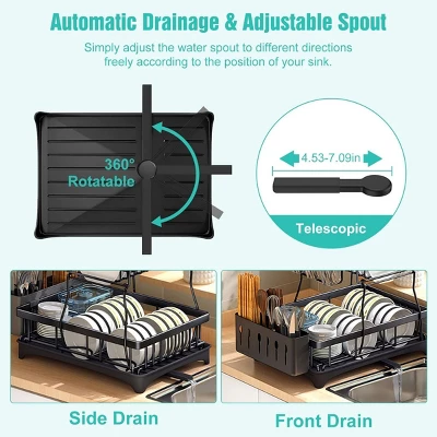 SEVOBAL 2-tier dish drainer blends large capacity with practicality—detachable tiers, a utensil holder, and cup rack accommodate dishes, pots, and mugs. Its auto-draining drainboard with a 360° swivel spout directs water to the sink, avoiding countertop mess. Made of rust-resistant carbon steel, it’s sturdy for long use. Compact enough for countertops, corners, or windowsills, it saves space effortlessly. Tool-free assembly takes just a minute.