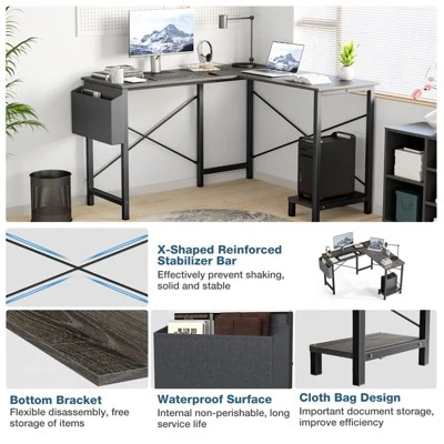 Maximize your workspace with this L-shaped corner desk, designed to fit snugly in tight areas. Its sturdy steel frame use, while the spacious surface accommodates dual monitors and office supplies. Enjoy efficient storage with a bracket for devices and a side pocket for organizing essentials. Easy assembly is supported with all necessary tools and instructions.