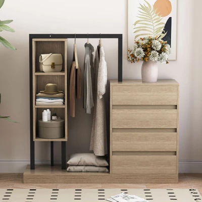 SEVOBAL wardrobe offers ultimate organization with 3 open compartments, multiple shelves, 4 drawers, and extra cabinets—ample space for clothes, shoes, and essentials. Available in white, natural wood, or brown, it complements any decor, adding sophistication. Crafted from high-quality materials, it’s durable for daily use. Some assembly is required, but clear instructions and tools are included. Perfect for bedrooms, it balances functionality and style to keep spaces tidy and elegant.