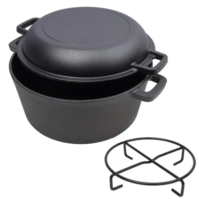 SEVOBAL pre-seasoned two in one Dutch oven delivers cooking flexibility by combining a deep pot with a skillet style lid for easy switching between methods. Both pieces include double loop handles for steady lifting and secure handling. Its roomy design is ideal for preparing and serving meals for the whole family. The included rack works as a heat shield for surfaces or as a stable support for outdoor cooking setups.