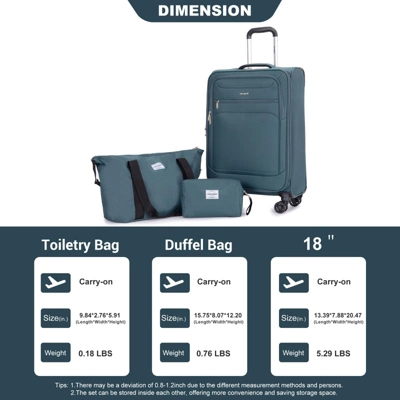 - Complete Luggage Set Included: This set comes with a carry-on suitcase, travel bag, and toiletry bag to meet all your travel needs and easily fits in overhead compartments or under seats.
