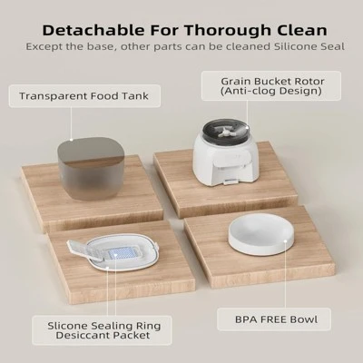 - Easy-Clean Design: Designed for convenience, the entire feeder disassembles quickly into three main components for thorough cleaning. All removable parts are washable and designed without hard-to-reach crevices where food particles might accumulate. For optimal food safety and hygiene, we recommend performing a complete cleaning every 15-35 days depending on usage frequency and environmental conditions.