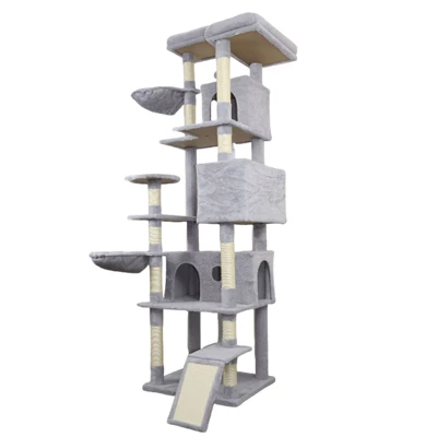 SEVOBAL 84-inch cat tree creates the ultimate playground for multiple feline friends. The light gray design blends elegantly with home decor while providing ample space for climbing, scratching, and napping. With sturdy construction and comfortable resting areas, it’s perfect for households with several active cats who love vertical exploration.