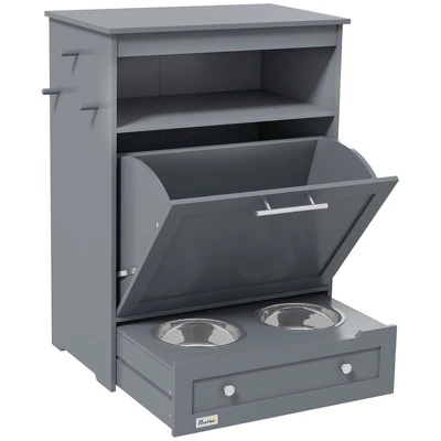 This gray pet feeder station offers a pull out drawer with raised bowls, organized storage with hooks and compartments, and a multifunctional design that complements any room